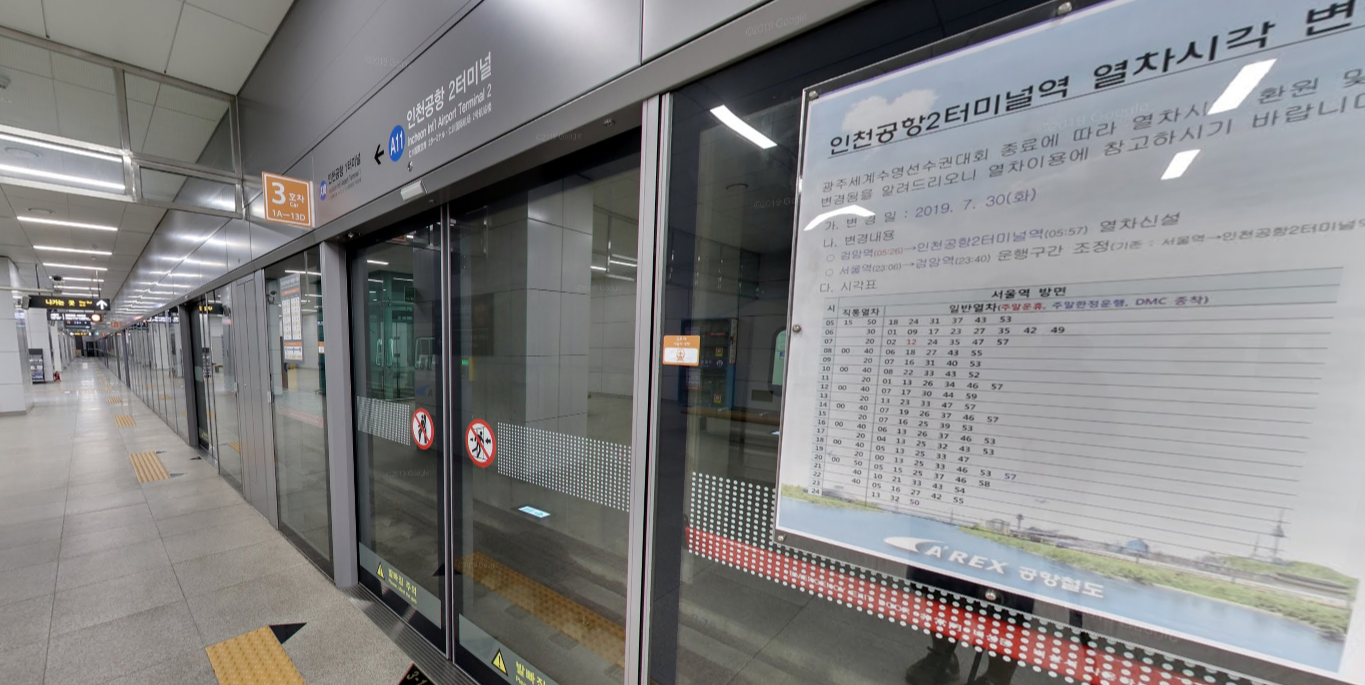 공항철도는 제2터미널, 제1터미널 지하 1층 교통센터에 위치하고 있고 공항철도 안내판에 따라 편리하게 이용할수 있습니다. 순환버스와 달리 1 정거장만 간다는것이 장점이지만 공항철도는 유료라는 점! 이동시간 : 6분