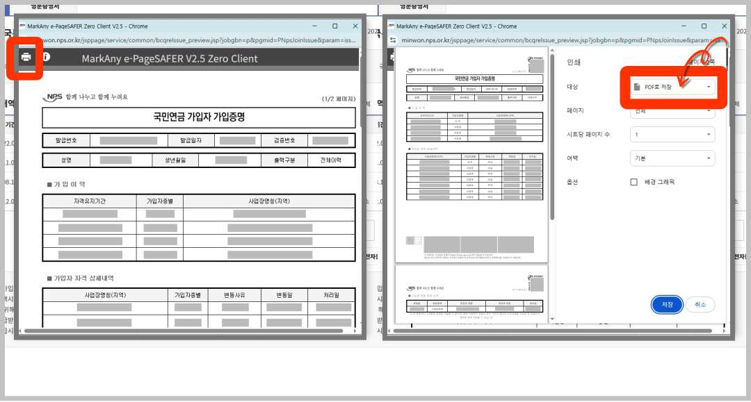 5. 왼쪽상단 프린트 아이콘 클릭 > 인쇄 대상에서 PDF로 저장하기