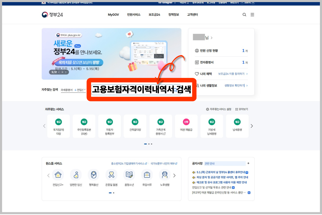 1. 검색창에 [고용보험자격 이력내역서] 검색