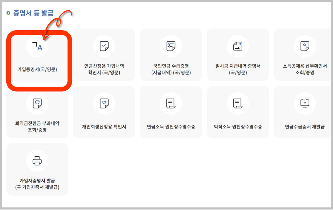 ① 국민연금공단 홈페이지 접속 ② 공동 인증서 또는 간편인증 로그인 ③ [개인서비스]→[가입증명서 발급] 메뉴 선택 ④ 국문 또는 영문 선택 후 개인 정보 수집동의 ⑤ 사업장명 선택하고, [프린트발급] 클릭하여 출력 또는 pdf 파일로 저장 |